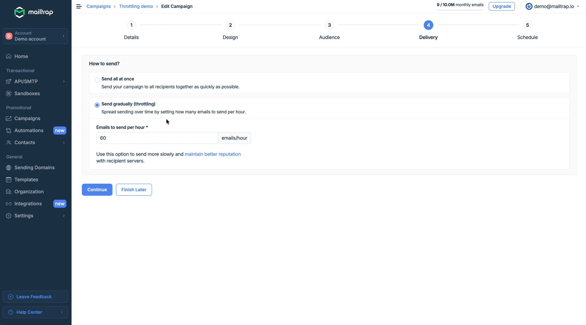 How it works: Set a maximum number of emails per hour (e.g., 100/hour), and Mailtrap will automatically pace delivery to stay within your limit. This way, you can use it to:
